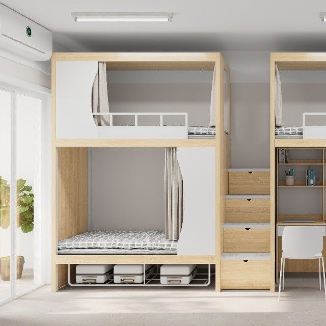 Litera de diseño moderno para albergue juvenil con instrucciones de montaje sencillas