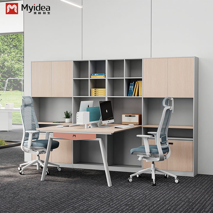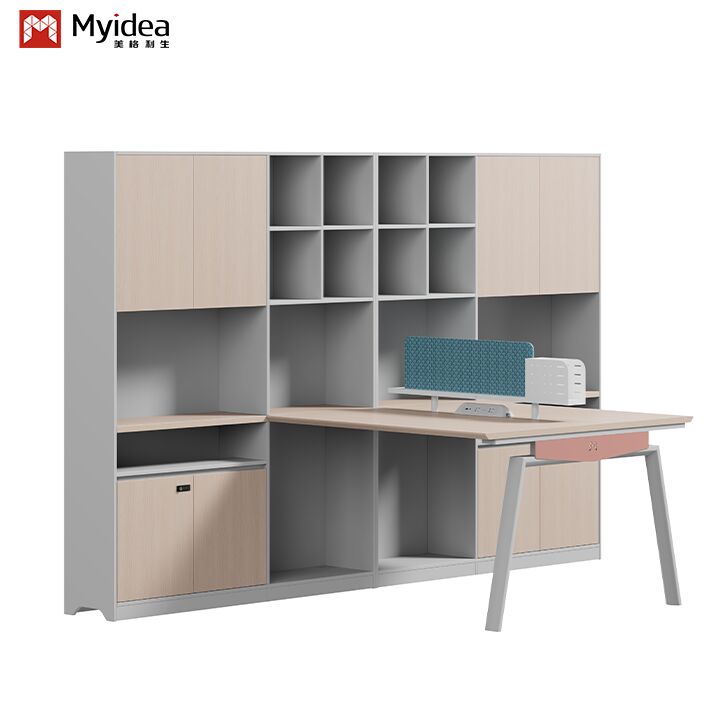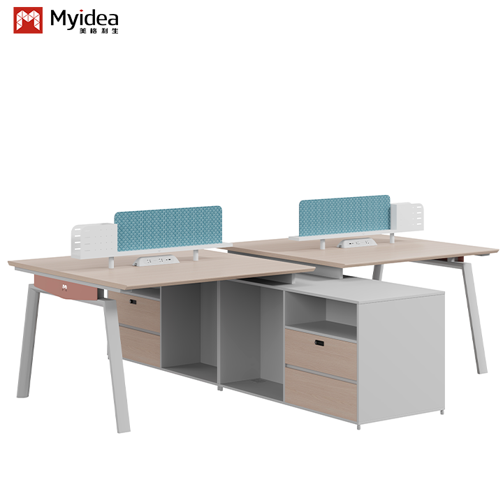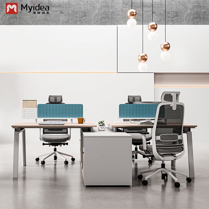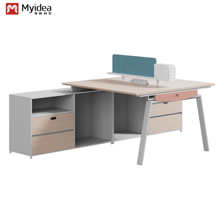 Escritorio de madera ecológico moderno con pantalla de tela y patas de acero, mueble de oficina independiente con gran gabinete de almacenamiento